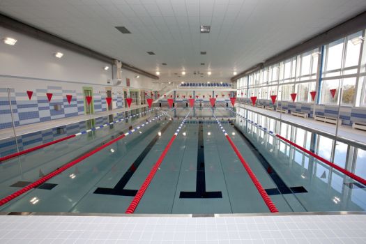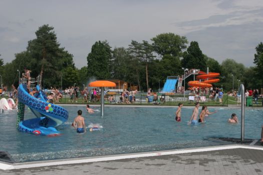 - Velký bazén s tobogánem, skokanským můstkem a plaveckými drahami, určen pro plavce