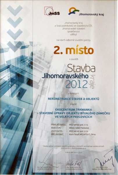 Naše firma získala za období roku 2012 ocenění za 2. místo v soutěži Jihomoravského kraje o stavbu roku, za stavbu Ekocentrum TRKMANKA - stavební úpravy objektu bývalého zámečku ve Velkých Pavlovicích.
